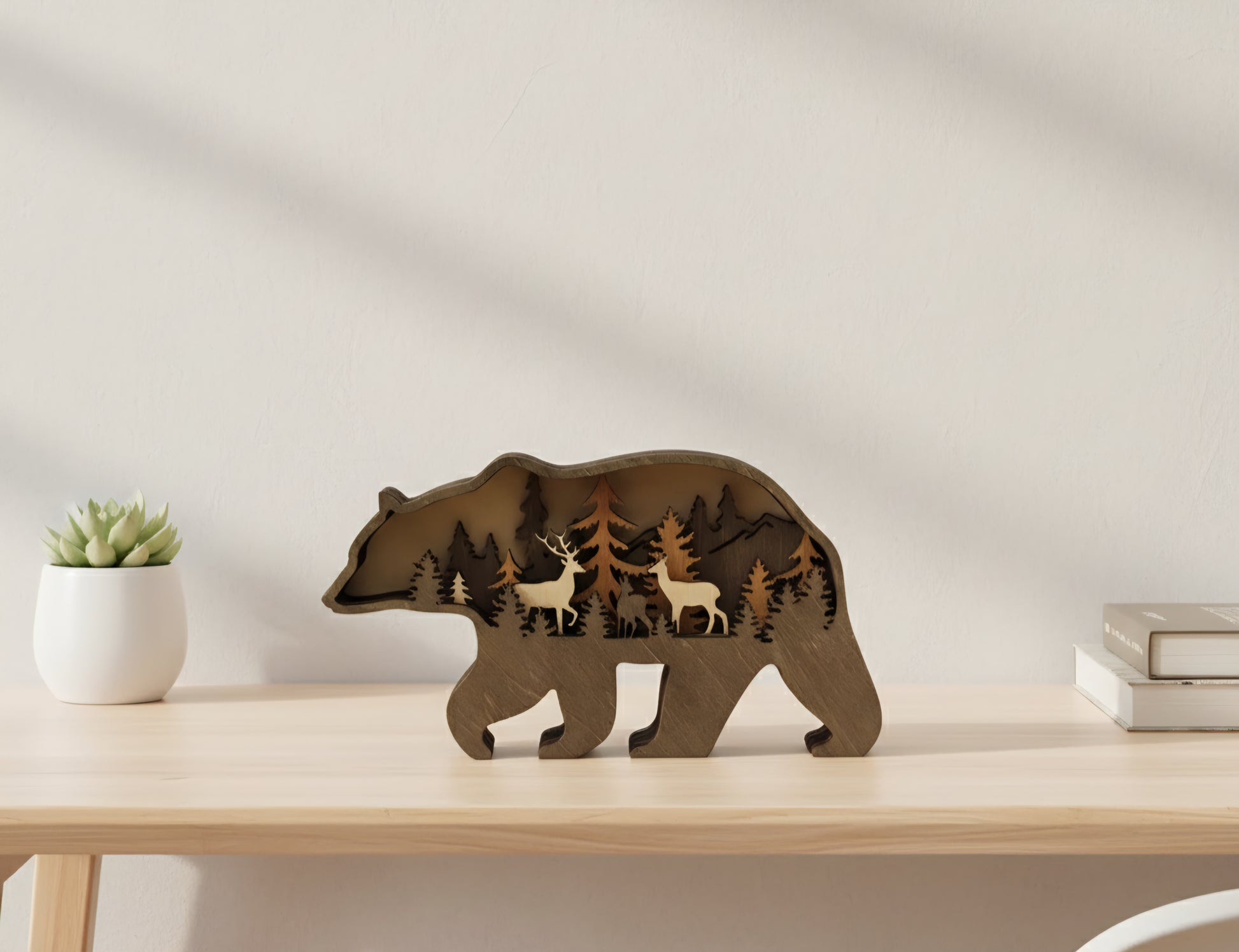 A beautiful, multi-layer carved wooden bear decoration featuring detailed forest animals (deer, elk, and moose). This unique North American wildlife craft is perfect for adding an artistic, rustic touch to your home décor, living room, or bedroom. A lovely, natural statement piece.